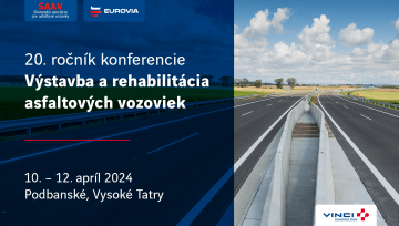 Spoločne so Slovenskou asociáciou pre asfaltové vozovky (SAAV) sa podieľame na organizácii 20. ročníka odbornej konferencie Výstavba a rehabilitácia asfaltových vozoviek, ktorá sa bude konať 10. – 12. apríla 2024 v Podbanskom vo Vysokých Tatrách.