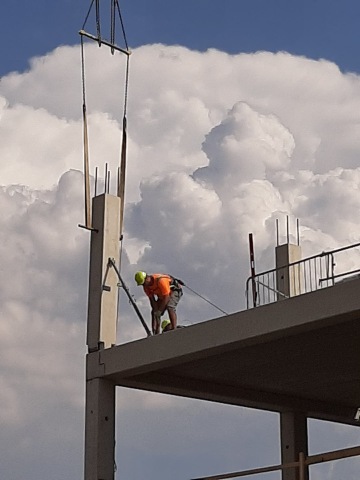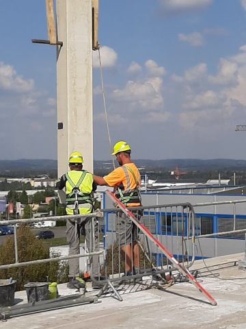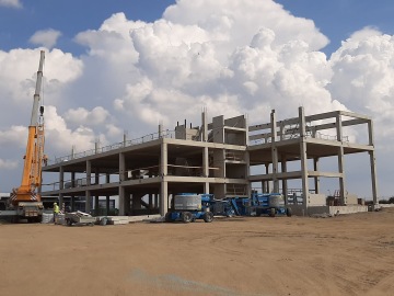 Aktuálně se stavaři blíží do finále s montáží prefa skeletu celé budovy. Tato fáze výstavby se prolíná s výrobou a zahájením montáže ocelových konstrukcí, která bude završena montáží ocelových plechů v rámci střešní konstrukce. Zároveň bude probíhat montáž opláštění s cílem uzavření vnějšího pláště budovy (bez výplní otvorů) do konce roku 2023.