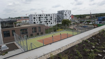 o třech třídách nebo učebny pro první stupeň, v objektu C se nachází tělocvična, na jejíž střechu jsme netypicky umístili sportovní hřiště, jídelnu